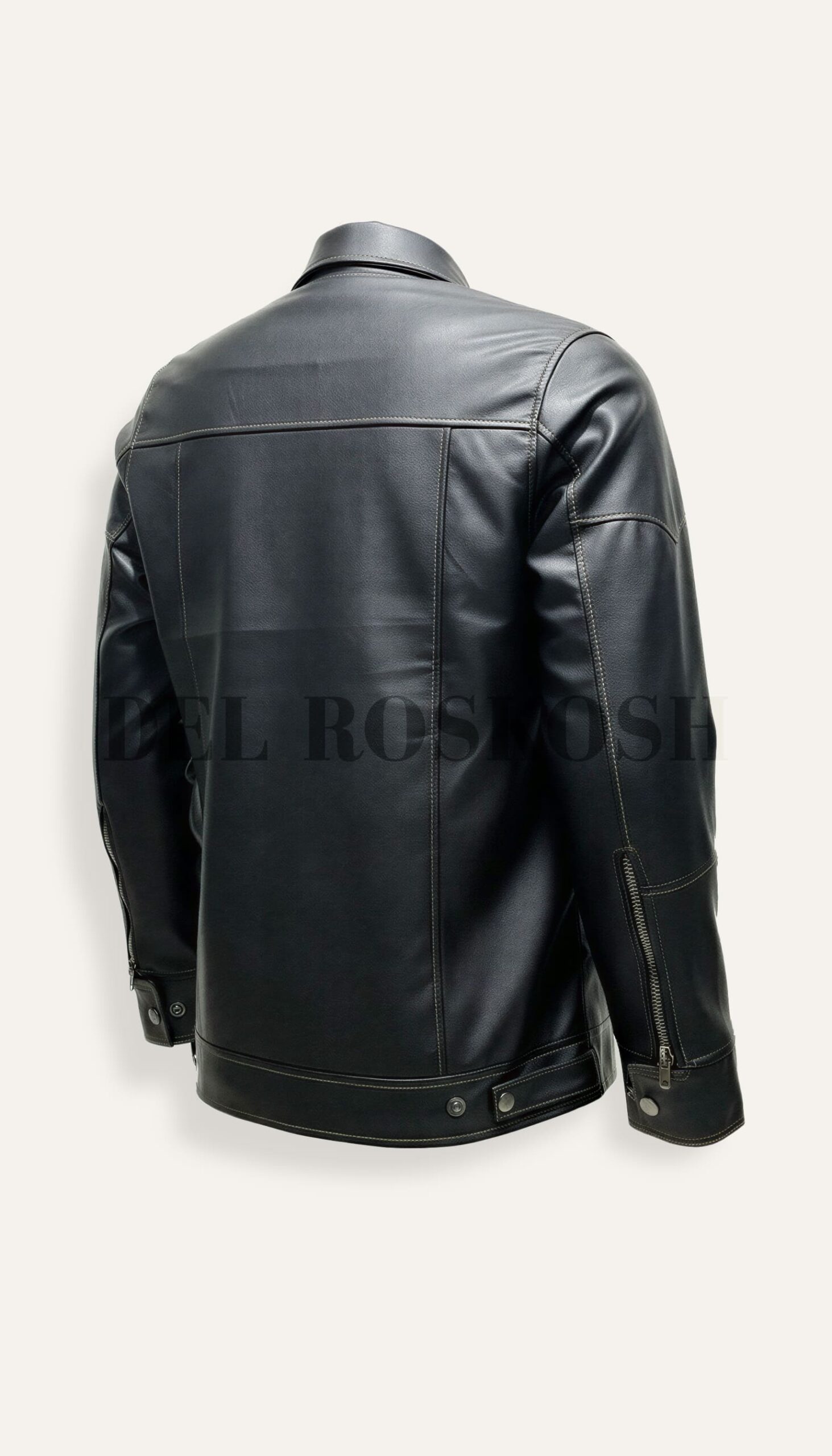 Crafted from premium faux leather, this sleek black jacket combines modern style with classic design details. It features durable YKK zippers, dual flap chest pockets, and contrast stitching for a bold finish. Perfect for casual or semi-formal wear, offering comfort and timeless appeal.