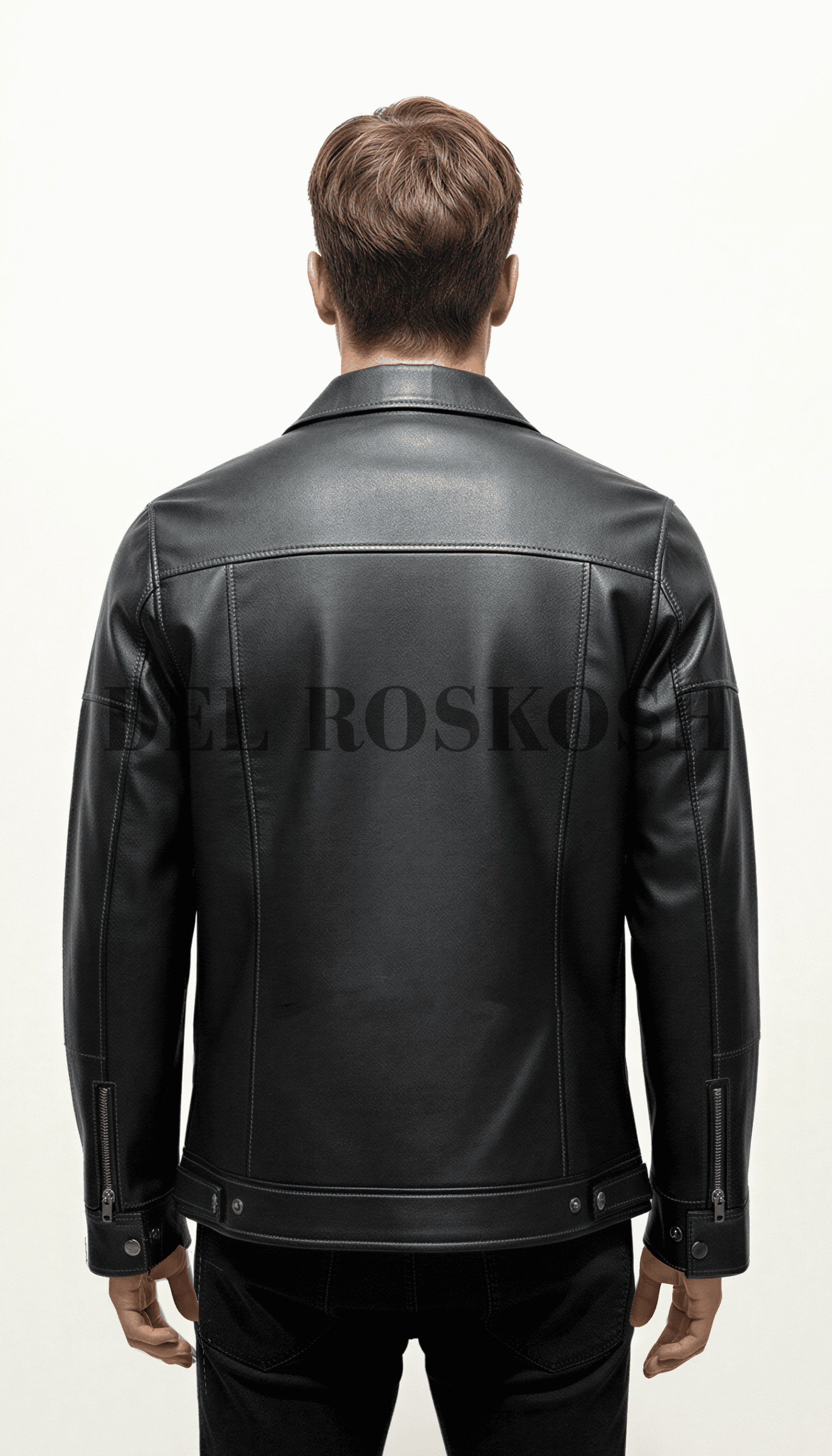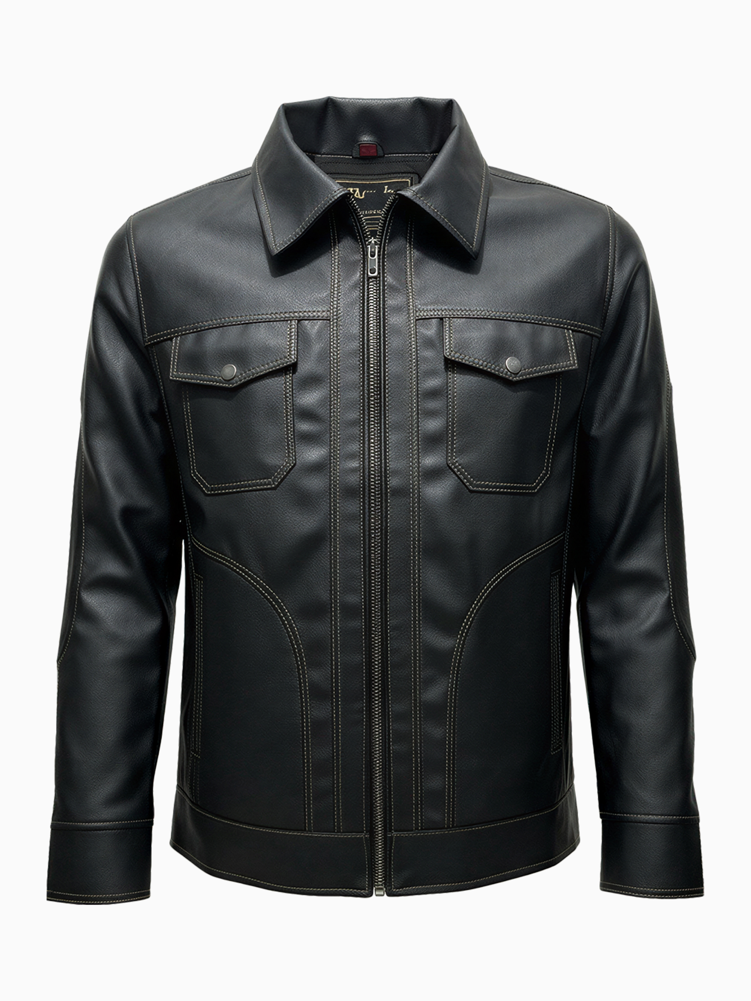 • Classic Workwear Design – Men’s faux leather jacket with a timeless shirt collar, flap chest pockets, and contrast stitching for a rugged yet stylish look.